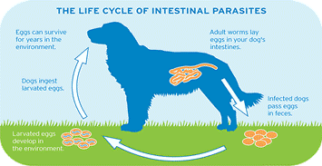 Most intestinal worms follow a very similar life cycle - that is, a pet licks/ingests contaminated material containing eggs, adult worms grow within the body, and lay eggs which are expelled in their faeces. See Figure 2 for a visual representation. Contaminated material can be anything from faeces and dirt, to plant matter, offal/raw food or milk from a bitch.