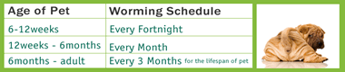 Prevention is key to keeping intestinal worms at bay. Prophylaxis can start in pets from as little as 6weeks old. The regime as demonstrated in Figure below should be followed. Keep in mind, the worming schedule after the 6 month mark depends on which product is being used. There are a few different types of intestinal wormers available - all of which are in tablet form, except Bravecto Plus (an all in one flea, tick, intestinal worm and heart worm prevention) for cats - and some that require boosters every month (such as NexGard Spectra), or every 3 months (such as Drontal/ Cazitel).